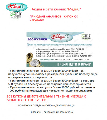 Медицинский центр МедиС - это учреждение широкого профиля, предлагающее специально подобранный комплекс услуг для каждого клиента. В работе клиники все построено с учетом максимального комфорта для посетителей. Оборудование кабинетов позволяет провести диагностические исследования организма пациента для составления программы лечения и профилактических мероприятий. В клинике открыты отделения психиатрии, общей терапии, кардиологии, ревматологии, гастроэнтерологии, пульмонологии, нефрологии, неврологии, эндокринологии, дерматологии, урологии, колопроктологии, гинекологии, маммологии, онкологии, психотерапии, наркологии, офтальмологии, оториноларингологии, педиатрии, ортопедии. Наши врачи имеют высокую квалификацию и с пониманием отнесутся к вашим проблемам. Доверяя свое здоровье нам, вы можете быть уверены в результате. Также мы сможем помочь с составлением диеты.